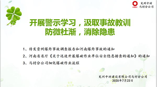 馬村分公司于7月23日下午在會議室舉行了“開展警示學(xué)習(xí),汲取事故教訓(xùn),牢筑安全防線”的會議,會議為大家轉(zhuǎn)發(fā)了《貴州凱里市舟溪鎮(zhèn)“3.19”較大爆炸事故調(diào)查報告》及河南欒川縣爆炸事故有關(guān)情況、河南省省廳《關(guān)于迅速開展爆破作業(yè)單位安全隱患排查的通知》。同時為了認(rèn)真貫徹“安全第一、預(yù)防為主”的方針,切實(shí)做好現(xiàn)場安全爆破作業(yè),并規(guī)范管理使用民用爆炸物品的工作,從根本上消除爆破安全隱患,杜絕爆破事故的發(fā)生,實(shí)現(xiàn)安全生產(chǎn),馬村分公司參會人員學(xué)習(xí)爆破作業(yè)安全規(guī)程的相關(guān)知識。 學(xué)習(xí)完調(diào)查事故報告及相關(guān)通知后,分公司涉爆人員紛紛根據(jù)自身工作情況結(jié)合學(xué)習(xí)內(nèi)容積極展開自查自糾活動,其中結(jié)合分公司公司實(shí)際,管理人員提出以下問題: 分公司執(zhí)行經(jīng)理劉黨提出:一是現(xiàn)場涉爆人員在卸載炸藥時,要輕拿輕放,避免炸藥和地面石塊等發(fā)生碰撞,產(chǎn)生火花發(fā)生殉爆;二是在制作起爆器材時,用木棍先在乳化炸藥包裝上扎眼,再插入電子雷管,禁止用金屬物件,以免發(fā)生安全隱患。 經(jīng)理助理曲光澤提出:一是在民爆物品審批時,一定要按照打孔孔數(shù)申報,提前規(guī)劃、計算好需要的數(shù)量,防止數(shù)量過多,以免后續(xù)存在安全隱患;二是有爆破作業(yè)時,一定按照河南省公安下發(fā)的通知,爆破工程技術(shù)人員、爆破員(2人)、安全員及保管員(2人)及時到位,履行各自的職責(zé),并及時拍照上傳給公安機(jī)關(guān)。 安全員王建平提出:爆破現(xiàn)場要及時做好安全警戒,用警戒繩劃出爆破范圍;并且爆破作業(yè)區(qū)域內(nèi)禁止吸煙、攜帶打火機(jī),并要求現(xiàn)場人員相互監(jiān)督,及時制止不安全行為,消除一切安全隱患。 最后由項(xiàng)目經(jīng)理李文軍做最后總結(jié),先是通過對貴州凱里市舟溪鎮(zhèn)“3.19”較大爆炸事故調(diào)查報告的學(xué)習(xí),大家要學(xué)習(xí)“四不放過”原則,深刻汲取事故教訓(xùn),防微杜漸,消除隱患。并且著重強(qiáng)調(diào)安全無小事,尤其是涉及到爆破作業(yè),更要小心謹(jǐn)慎,時刻謹(jǐn)記“四不傷害”原則,保證自己的安全也要保證他人的安全。更要注意細(xì)節(jié),從民爆物品的審批開始,必須有申請單,根據(jù)炮孔總米數(shù)計算藥量,爆破工程技術(shù)人員審批后,才可以進(jìn)行民爆信息平臺的申請,后續(xù)的領(lǐng)用、發(fā)放,裝卸,裝藥、填塞,警戒,起爆,爆后檢查等一系列流程,都要保持著細(xì)心、小心、耐心的態(tài)度進(jìn)行各自的工作。同時要求分公司涉爆人員根據(jù)自己的崗位,細(xì)化流程,盡早擬定一份爆破作業(yè)流程,供分公司人員學(xué)習(xí)。