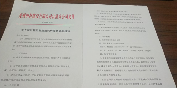 春節期間,一場突如其來的新冠病毒肺炎席卷全國,疫情防控形勢嚴峻。疫情就是命令,按照上級黨委要求,做出部署和安排,兗州中材第一時間成立由總經理任組長的疫情防控領導小組,及時制定和啟動應急預案,各分公司和項目部按照疫情成立了疫情防控組織機構,成立了疫情防控青年突擊隊,對所屬分公司積極推出疫情防控制度與措施,認真宣傳,抓好落實,嚴防死守,阻斷疫情傳播,切實做好疫情防控和復工復產等各項工作,切實保障員工生命安全和身體健康。針對當前疫情情況,分公司具體通過以下措施確保安全復工復產: