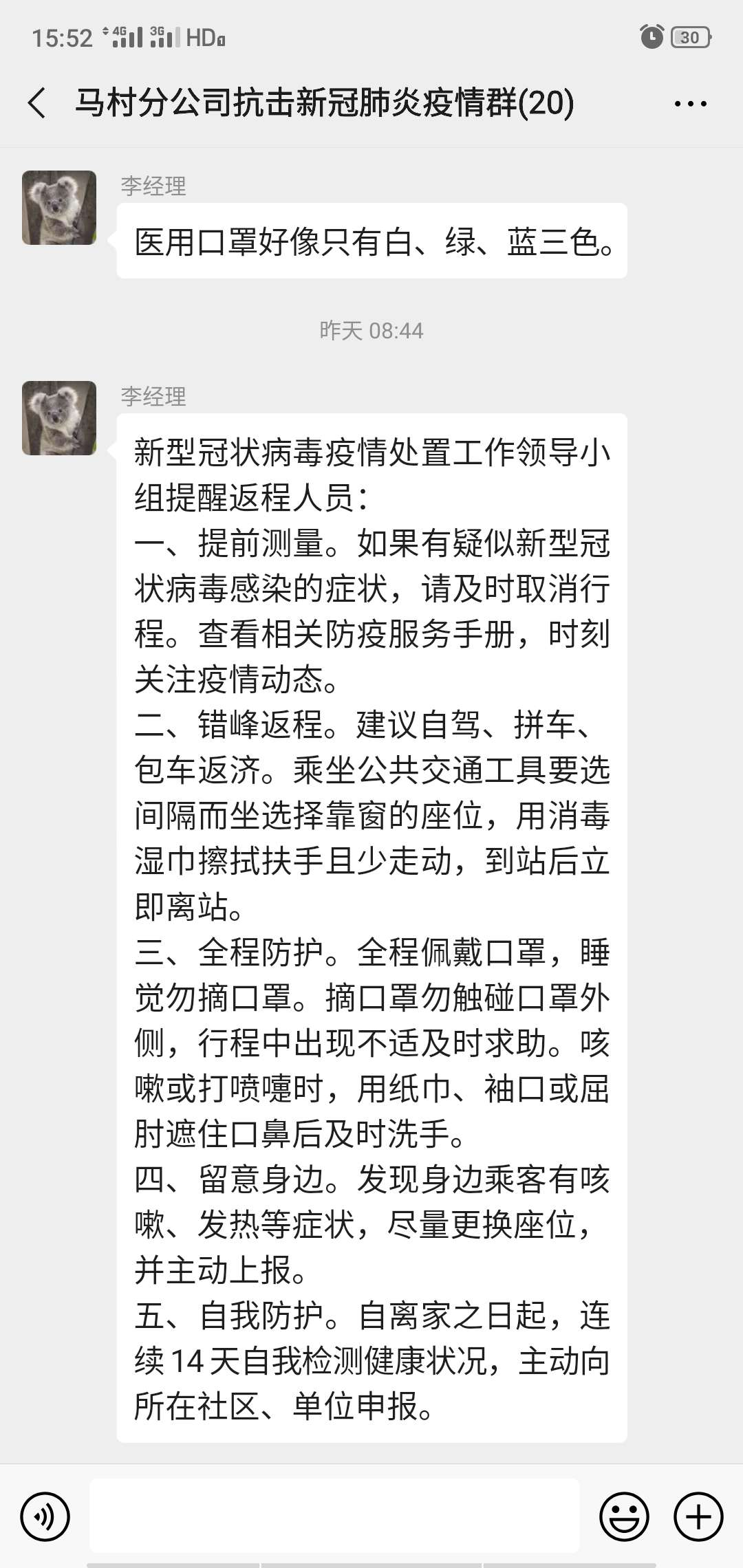 突如其來的災(zāi)難讓本該舉國同慶的春節(jié)變的人心惶惶。為打好這場保衛(wèi)全國人民的硬仗,2020年1月25日前后,全國30多個(gè)省啟動(dòng)重大突發(fā)公共衛(wèi)生事件一級(jí)響應(yīng),實(shí)行最嚴(yán)格的科學(xué)防控措施。同時(shí)各地方政府也出臺(tái)相應(yīng)的防控的舉措。 為有效控制疫情的傳播,針對(duì)疫情期間的各項(xiàng)工作安排,兗州中材馬村分公司于2020年1月29日成立應(yīng)對(duì)疫情工作領(lǐng)導(dǎo)小組。根據(jù)省委、省政府及公司關(guān)于做好疫情防控的重大決策部署,全面落實(shí)分公司的相關(guān)工作要求,負(fù)責(zé)與分公司上級(jí)及地方、千業(yè)水泥疫情工作的聯(lián)系,協(xié)調(diào)好疫情期間的人員以及各項(xiàng)工作安排。 假期期間,通過網(wǎng)絡(luò)通訊設(shè)備進(jìn)行安全防疫宣傳教育。  通過宣傳欄、條幅等向員工傳達(dá)疫情防控知識(shí),提高疫情防控意識(shí)。   通過有效途徑采集各類防疫物資,主要包括醫(yī)用酒精、84消毒液、一次性口罩、便攜式噴霧瓶以及測溫儀等。    通過對(duì)辦公室、走廊、宿舍以及衛(wèi)生間等公共場所以及公共設(shè)備設(shè)施進(jìn)行消毒,早晚各一次。  分公司門口設(shè)置崗哨,無關(guān)人員禁止出入;對(duì)相關(guān)人員進(jìn)行信息登記,對(duì)進(jìn)出人員進(jìn)行測體溫并登記,無異常才允許進(jìn)入,如發(fā)現(xiàn)異常及時(shí)上報(bào)處理。  公司員工每天測量體溫,匯報(bào)身體狀況;對(duì)于外地返崗人員,按照相關(guān)規(guī)定進(jìn)行相應(yīng)的隔離,隔離期間每天3次匯報(bào)體溫,并接受地方政府及先關(guān)人員的監(jiān)督,確保萬無一失。
