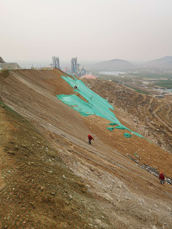 經過業主、監理及設計單位共同初步驗收,達到設計要求后,進行臺階及坡面覆土工作。按照設計要求,覆土厚度大于15厘米。掛網采用規格為5cm*5cm網格的鋼絲網進行全坡面覆蓋,加長錨桿固定的方式進行。在專業人員的努力下,經過二十天的奮戰,17000平方米的掛網工作順利完工。