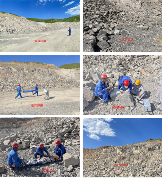 本次應急演練事故假定:由于現(xiàn)場管理人員未發(fā)現(xiàn)挖裝區(qū)上部已有裂縫的邊坡,汽車駕駛員并將車輛停放在采場+1260平臺靠近邊坡處檢查車輛,未觀察周圍及邊坡穩(wěn)定情況,突然邊坡坍塌,將汽車駕駛員腿部砸傷,現(xiàn)場員工發(fā)現(xiàn)后立即上報現(xiàn)場負責人。